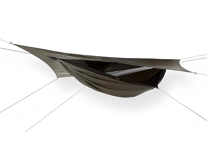 Hamaca con mosquitera y cubretecho integrados. Diseño asimétrico para un descanso plano. Peso total: 1.1 kg. Una de las mejores hamacas del mundo para viajes mochileros.
