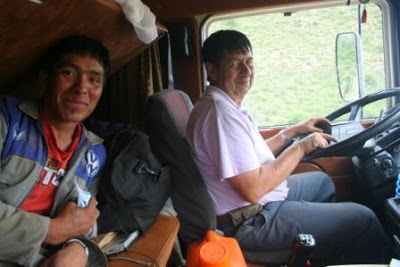 En apenas 20 minutos se detiene un camión. Es un Volvo, como casi todos en Bolivia. Un poco nervioso, y casi seguro de que querrán cobrarme, doy más explicaciones de lo necesario. Cuento que viajo hacia Entre Ríos pero que viajo por un largo tiempo y entonces tengo poco dinero y… Pero el acompañante mira al chofer y prontamente hace una seña de que suba. Bautismo de camión en las rutas bolivianas. Y no viajaba en un camión cualquiera, sino en “La Joya del Pacífico”, como reza el adhesivo sobre el parabrisas. El conductor se llama Guido, tiene unos cincuenta y tantos, y es acompañado por Dalmiro, quien se está fogueando en el oficio.