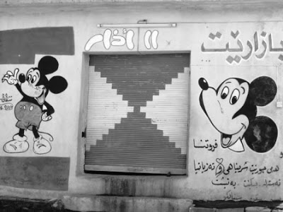Extrañas versions del ratón Mickey saludan desde el muro de una casa de ropa infantil en las afueras de Duhok. Camino con la brújula puesta en salir del país, rumbo a Turquía.