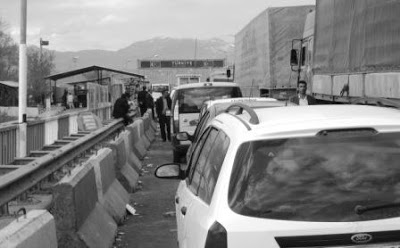 Cola de vahículos en la fronterea turco-iraquí. Por suerte encontré un taxi que aceptó llevarme gratis hasta el otro lado. Los guardias de frontera me dejaron pasar luego de que les mostrara en mi cámara digital fotos junto al primo de su presidente.
