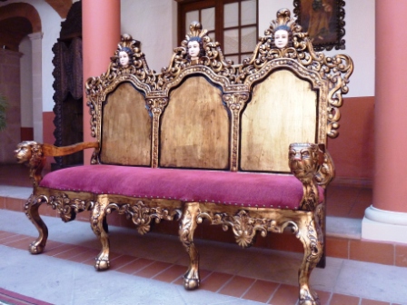 Por momentos siento que para poder compartir la delicada opulencia de la Sucre colonial mi pluma debería volverse también barroca, afiligranada, perderse en el laberinto del detalle. Mi curiosidad lo hace. Con diversas excusas nos infiltramos en señoriales casonas del siglo XVII. En una trabamos conversación con su propietario, quien la ha transformado en hotel. El me cuenta que la propiedad aparece ya en un pergamino pintado por Pedro Ramírez del Águila en 1639. Haciendo zoom en el pergamino uno observa que la casona yacía contigua a la Iglesia de Santa Clara, por lo que se presume que era su monasterio. De estilo renacentista español algo arruinado por simetrías neoclásicas fruto de la época republicana la casona se despliega como un museo. Hay sillones con relieves en estilo barroco mestizo que se me antojan tronos de dioses, con abullonada pana, madera pintada con oro, y rostros de agargolados ángeles de mirada vigilante y soberana. Carlos nos cuenta que la pieza tiene unos 300 años y proviene de Cochabamba. Los artesanos locales eran más proclives a representar su flora y fauna nativas (una especie de jaguareté sobresale del apoyabrazos) que las canónicas uvas que ni siquiera conocían.